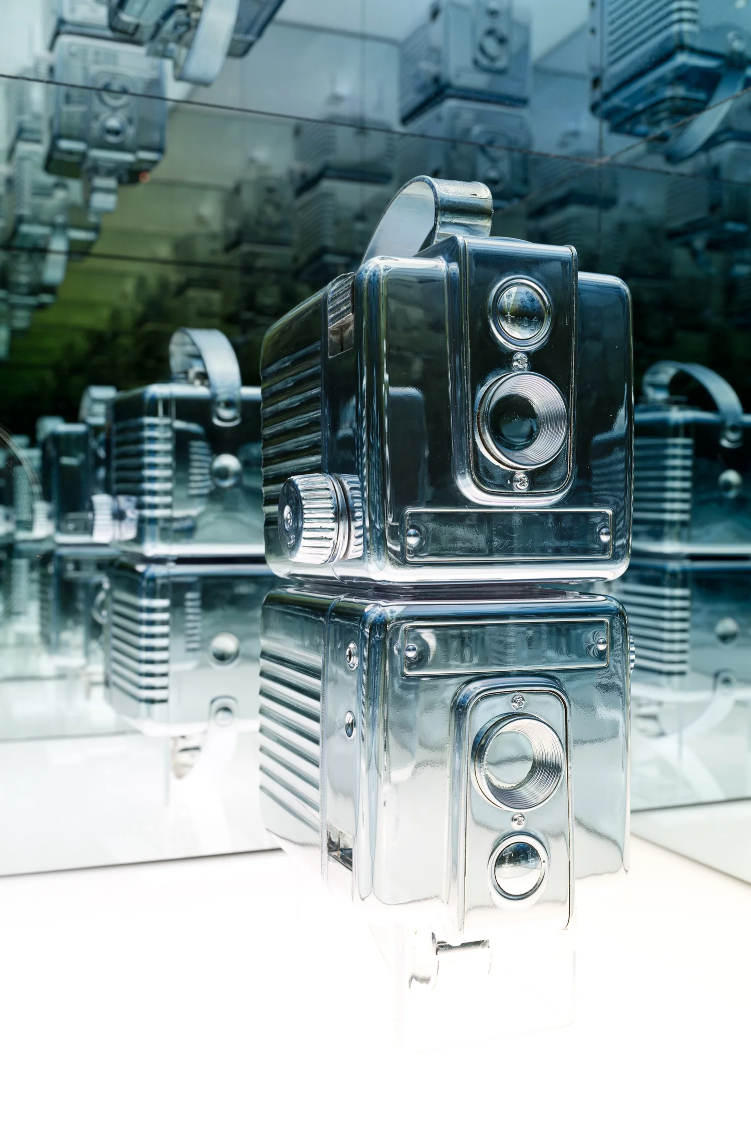 Elsewhere in the gallery space, Wright presents two separate mixed-media sculptural works that focus on the materiality of the camera itself. With Disused Twin Brownie Hawkeye Cameras, for example, Wright has cast two outdated Kodak Brownie cameras in silver and stacked them in a custom plinth. At first glance, this work seems to comment on the idea of the readymade by taking an obsolete and inexpensive piece of technology and turning it into a valuable commodity object. But taken further, we must also consider that in this silver casting, the camera and the lens are completely obstructed and shut off from the world, no longer an object to view from, becoming instead an object to be viewed. Looking more closely at the work, we also find that the cubic structure that houses the object is in fact a closed circuit of mirrors, reflecting inward and producing an infinite series of repetitions of the image of the silver camera. With the sculpture trapped within this impenetrable hall of mirrors, Wright stages a subtle role reversal of the camera, as it becomes a closed circuit of information – a sort of double negative of a visuality.